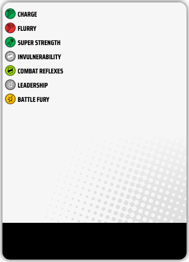 | Power | Charge, Invulnerability, Leadership, Super Strength |